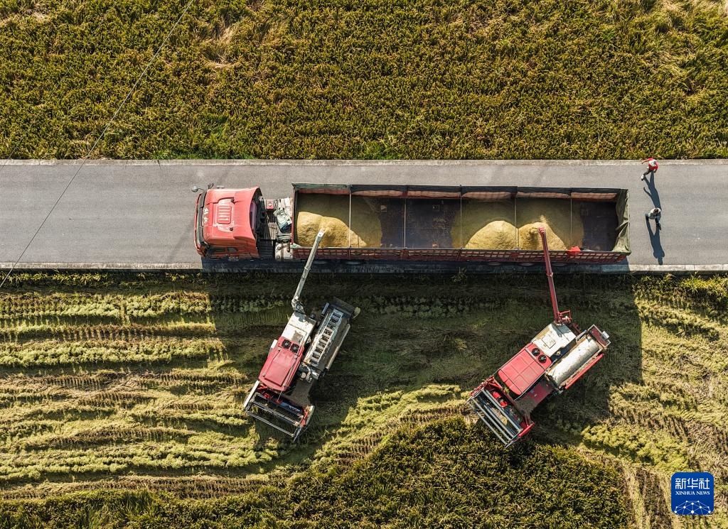 10月29日,工人操作收割机将收获的稻谷装车(无人机照片)。
