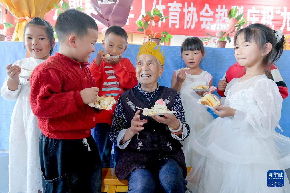 10月28日,小朋友在南涧县公郎镇公郎村幸福小院内为老人庆祝重阳节。