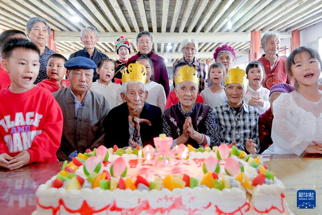 10月28日,老人在南涧县公郎镇自强村麦地平幸福小院庆祝重阳节(无人机照片)。