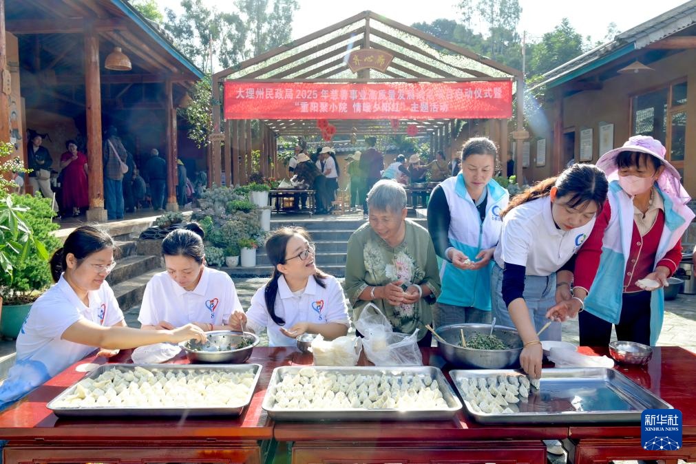 10月29日,志愿者在南涧县南涧镇西山村幸福小院内为老人包饺子。