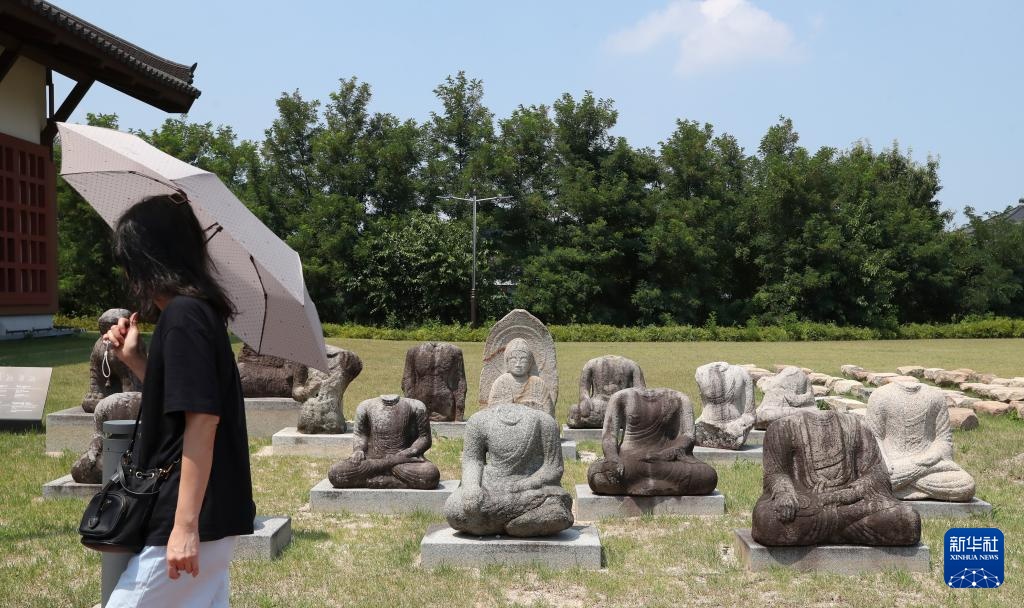 8月1日,游客在韩国庆州博物馆外参观新罗时代的石佛文物。