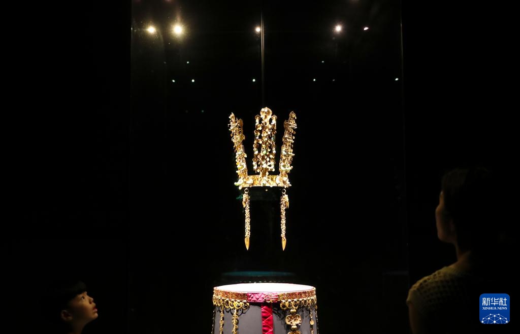 8月1日,游客在韩国庆州博物馆参观新罗时代的文物金冠。