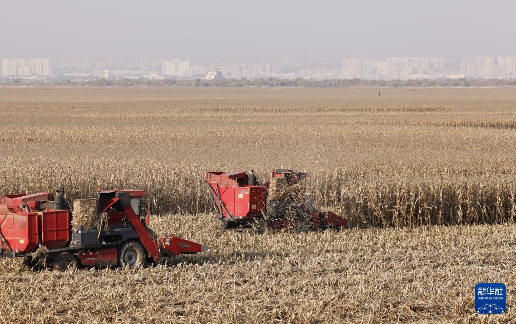 10月28日,农民驾驶收割机在内蒙古鄂尔多斯市达拉特旗收获玉米。