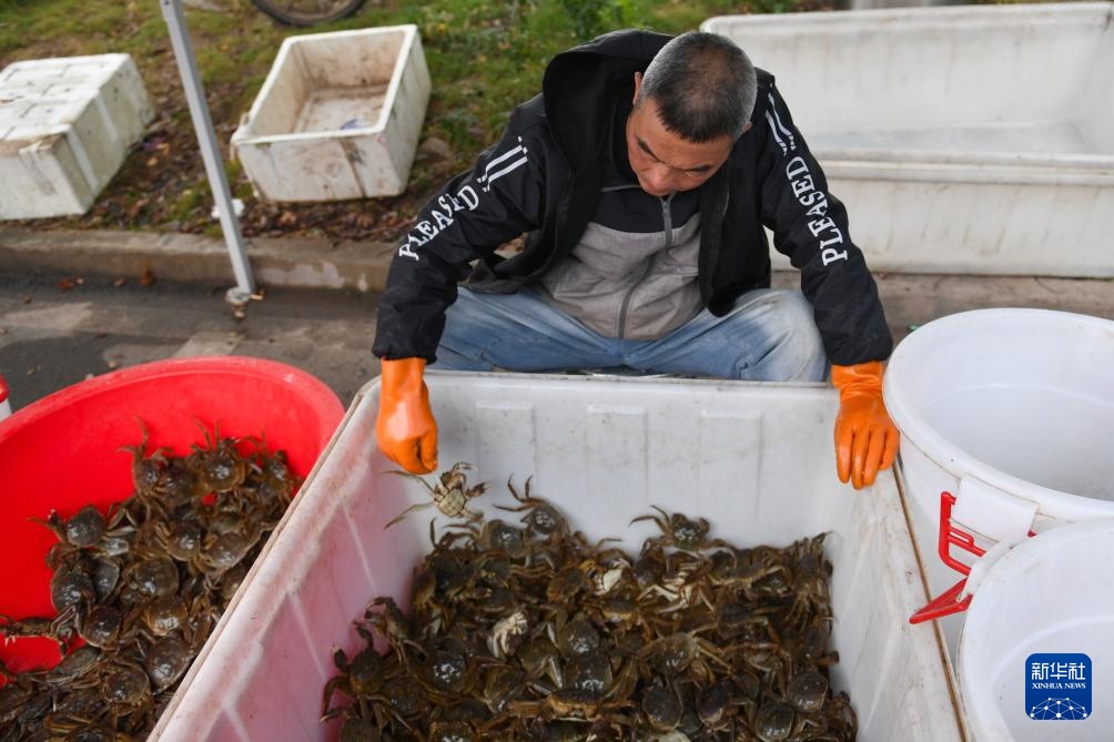 10月30日,在大通湖区河坝镇,蟹农将分拣后的大闸蟹投入暂养池。