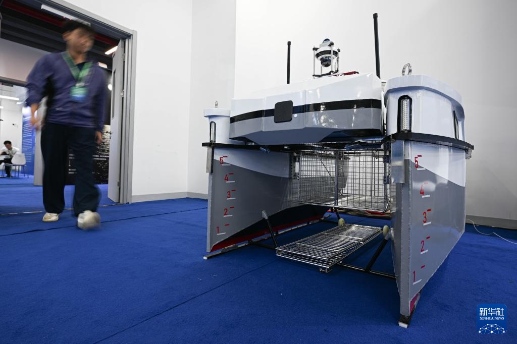 10月29日在深海先进技术及装备成果展上拍摄的智能巡航水面保洁无人船。