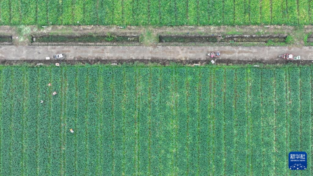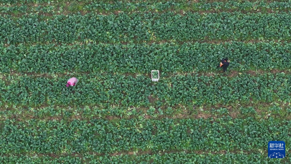 10月30日,菜农在沅江市草尾镇乐园村蔬菜田里采收蔬菜(无人机照片)。