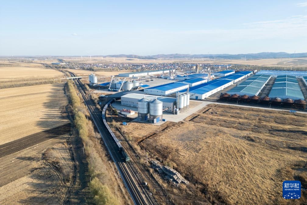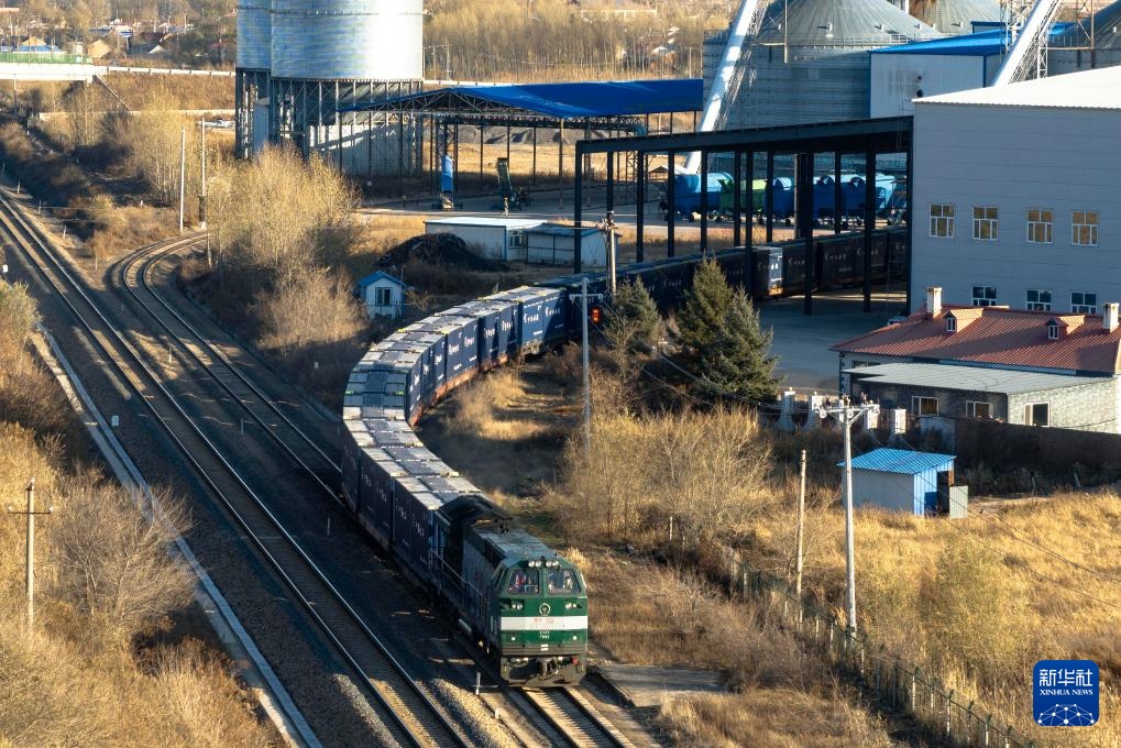 10月31日,满载玉米的列车从位于黑龙江省双鸭山市的升昌站驶出(无人机照片)。