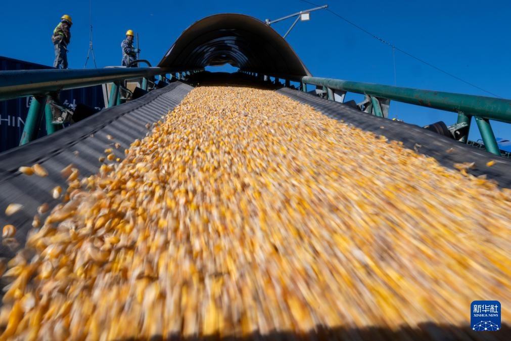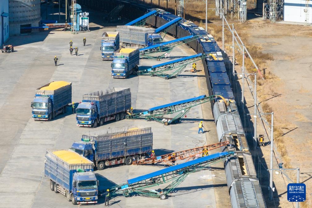 10月29日拍摄的位于黑龙江省鹤岗市的宝泉岭站黑龙江瓮福人和米业有限公司专用线上的玉米装车现场(无人机照片)。