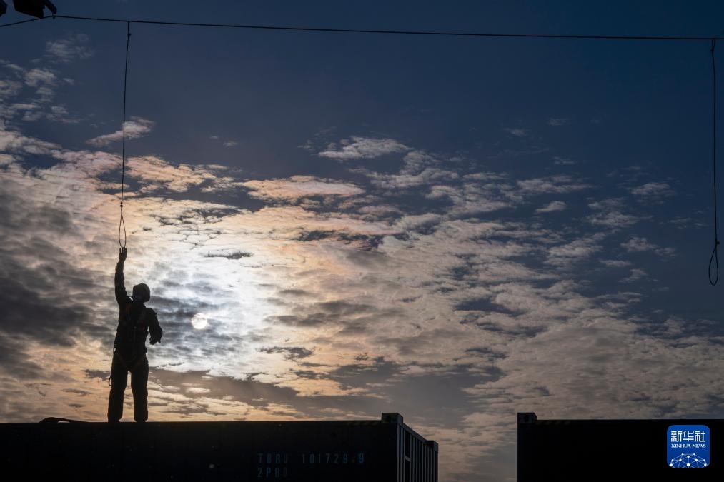 10月31日,在黑龙江省双鸭山市的中粮天兴物流园区专用线上,工人在进行装运作业(无人机照片)。