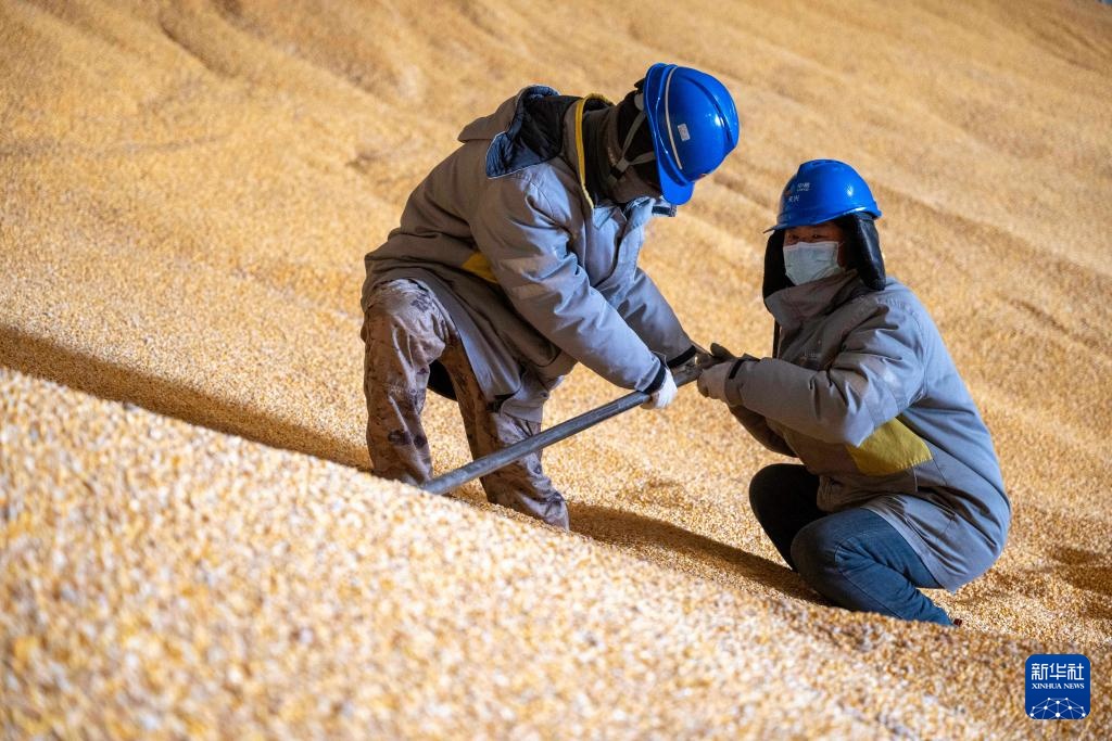 10月31日,在黑龙江省双鸭山市的中粮天兴物流园区仓储库,工人进行扦样作业,了解储存仓内大豆水分、杂质以及虫害等情况。