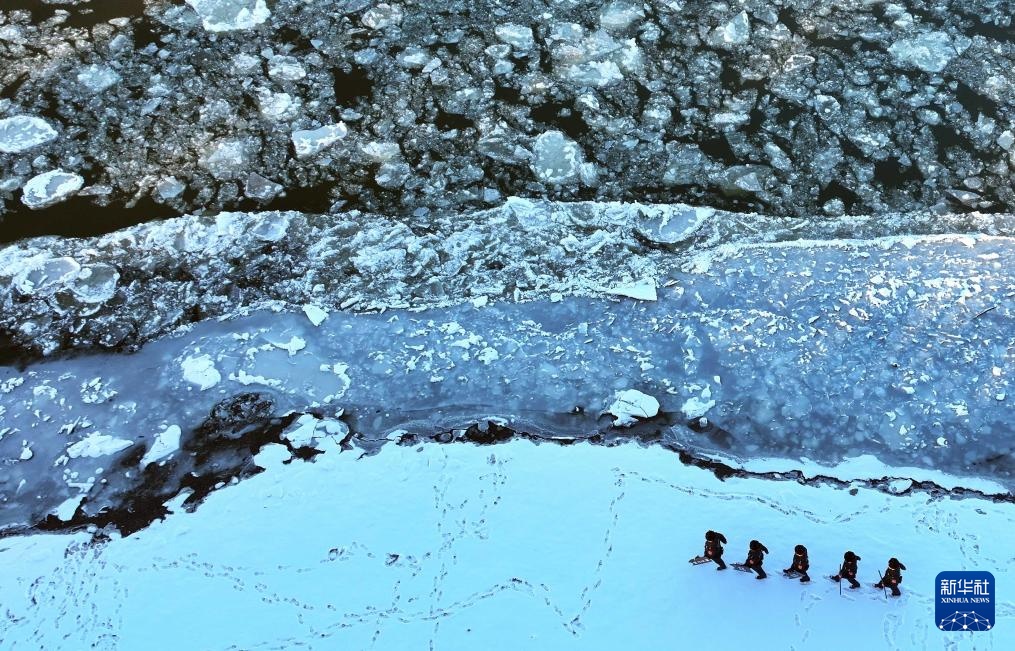 10月30日,黑龙江出入境边防检查总站黑河边境管理支队花园边境派出所民警在“跑冰排”的黑龙江黑河段江岸边巡逻(无人机照片)。