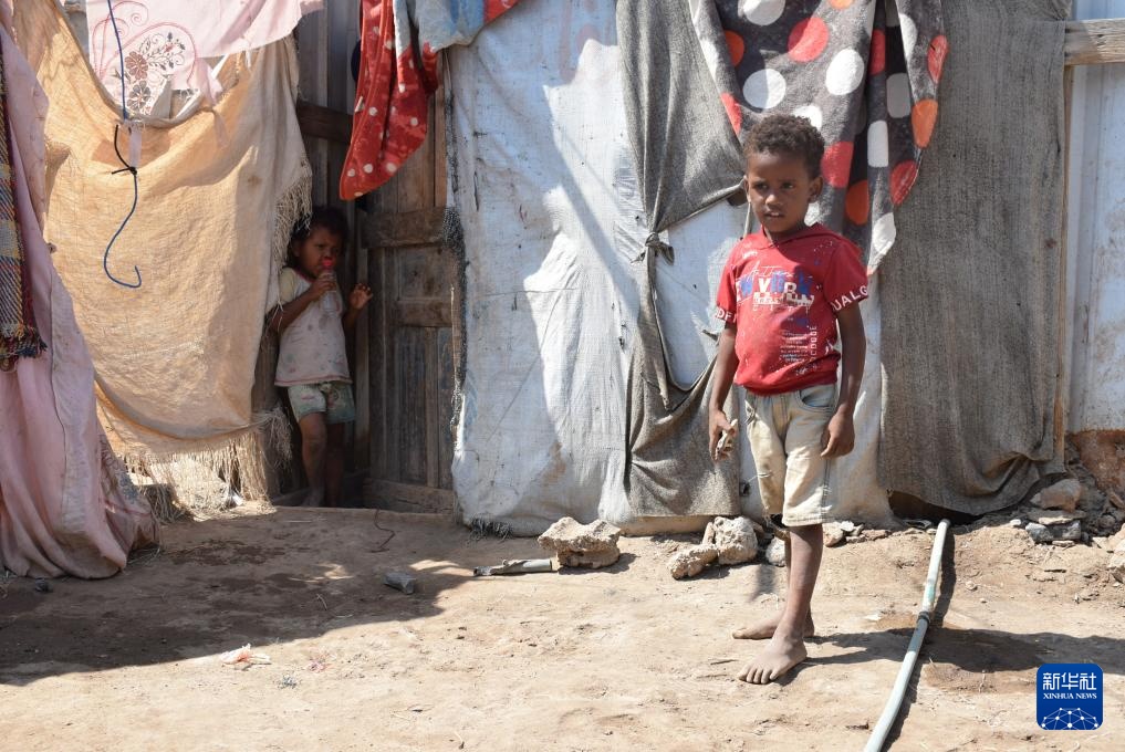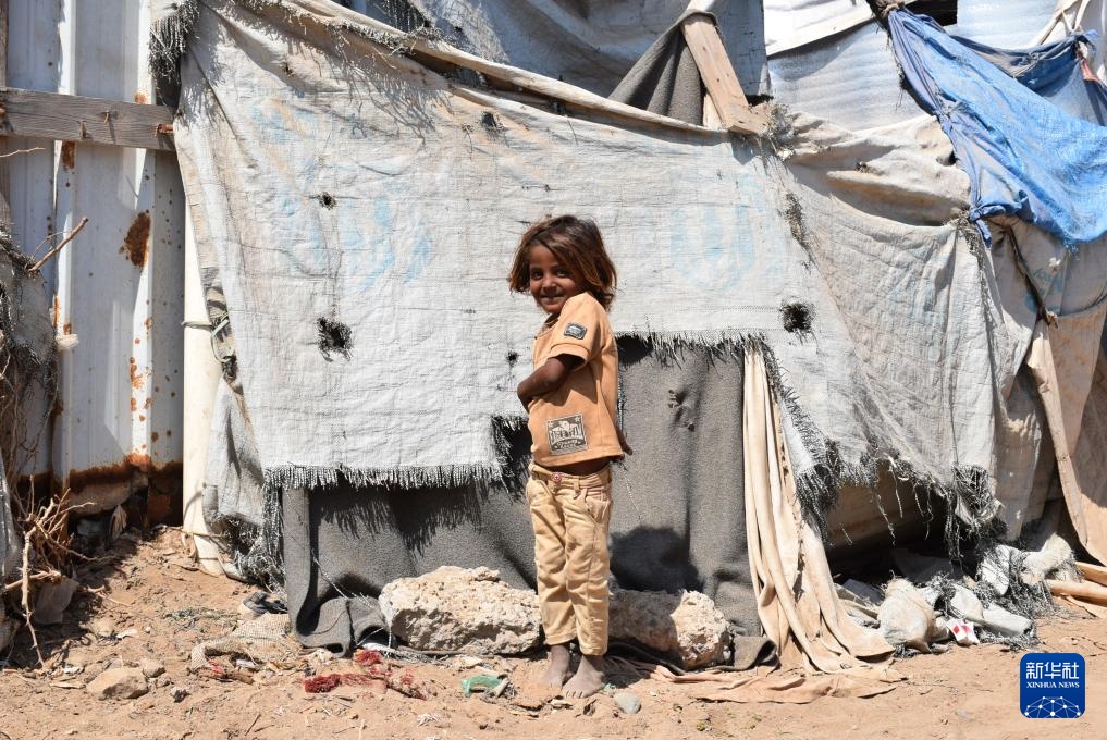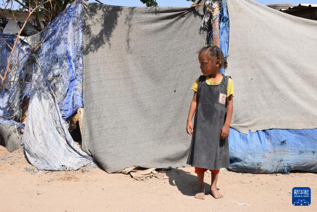 11月3日,在也门南部城市亚丁郊区,一名女孩站在自家帐篷外。