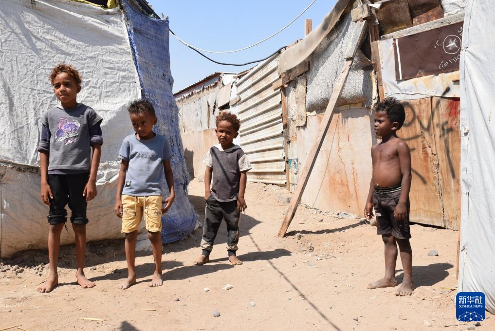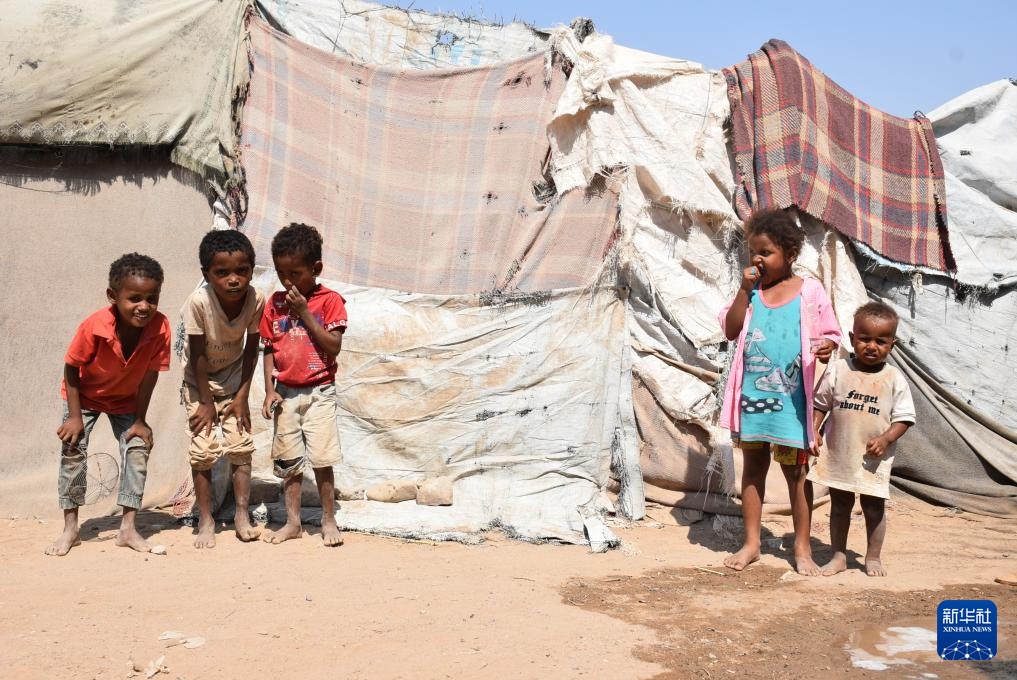 11月3日,在也门南部城市亚丁郊区,流离失所的孩子站在一处营地的帐篷外。