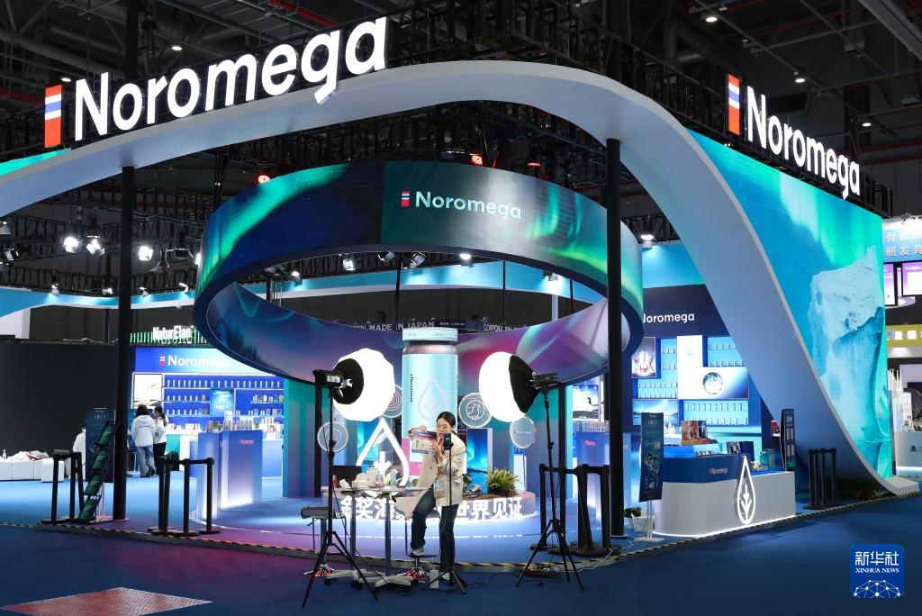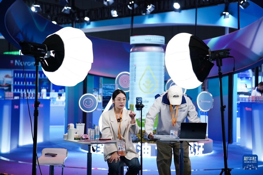 11月4日,工作人员在第八届进博会医疗器械及医药保健展区直播。
