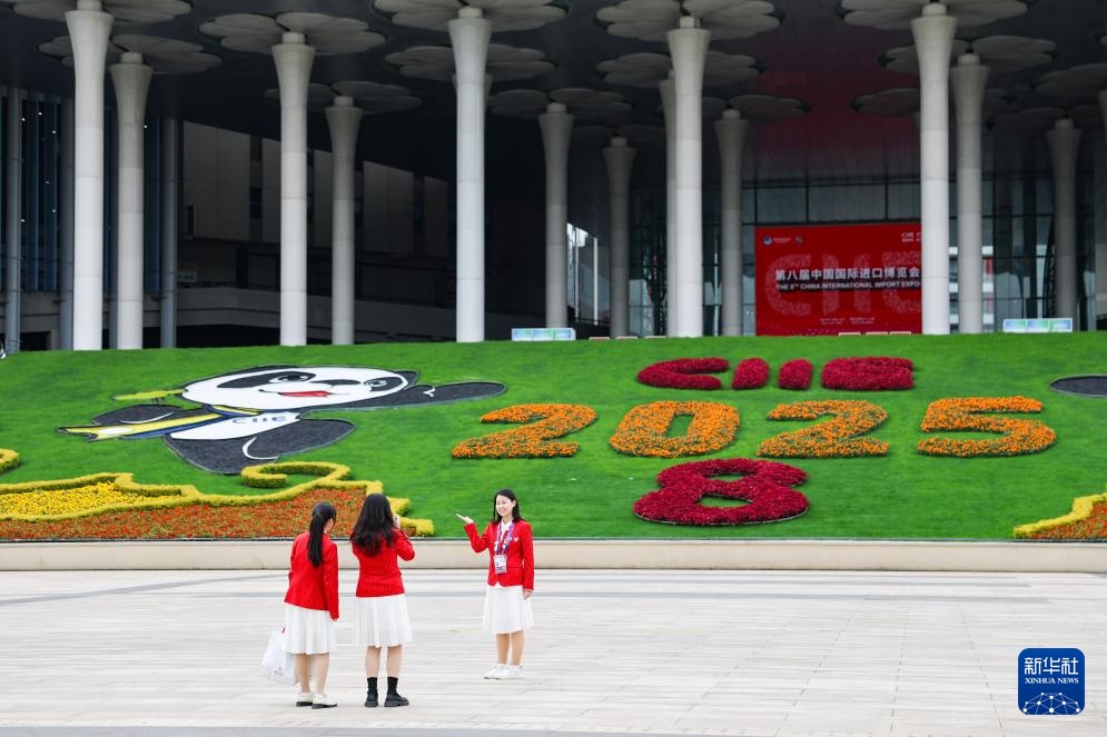 这是11月4日在第八届进博会举办场地——国家会展中心(上海)拍摄的进博会宣传标识。
