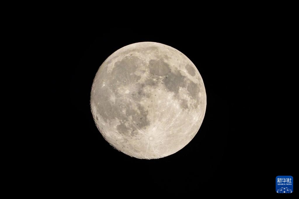 11月4日,在北京市昌平区东小口城市休闲公园拍摄的中国空间站飞过圆月的过程(堆栈合成照片)。