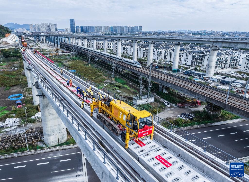 11月5日,在浙江省台州市杭台高铁温岭至玉环段施工作业现场,中铁十四局工作人员操作长轨牵引车进行铺轨作业(无人机照片)。