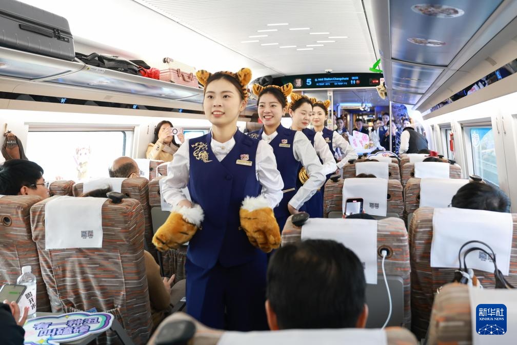 11月5日,中国铁路哈尔滨局集团有限公司哈尔滨客运段担当的G902次首趟“萌虎”主题列车从哈尔滨西站驶出,开往北京。列车以“龙江冰雪蓝”为基调,融合东北虎元素装饰车厢,让旅客在旅途中感受龙江冰雪文化的独特魅力。