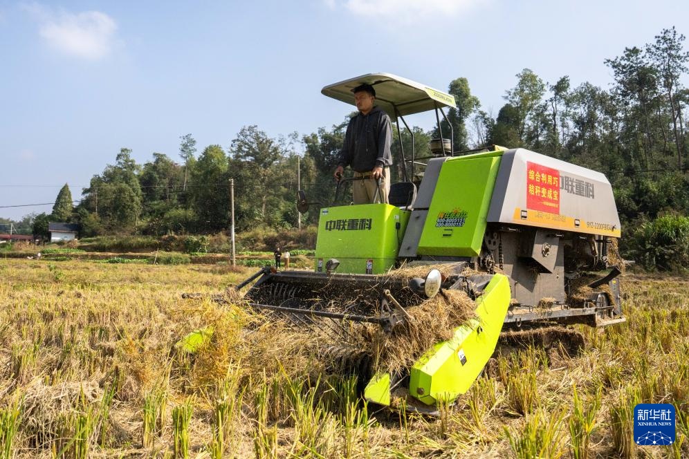 11月5日,在长沙县开慧镇开慧村,村民操作自走式秸秆打捆机回收水稻秸秆。