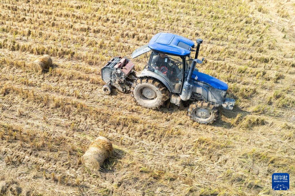 11月5日,在长沙县开慧镇开慧村,村民操作牵引式秸秆打捆机回收水稻秸秆(无人机照片)。