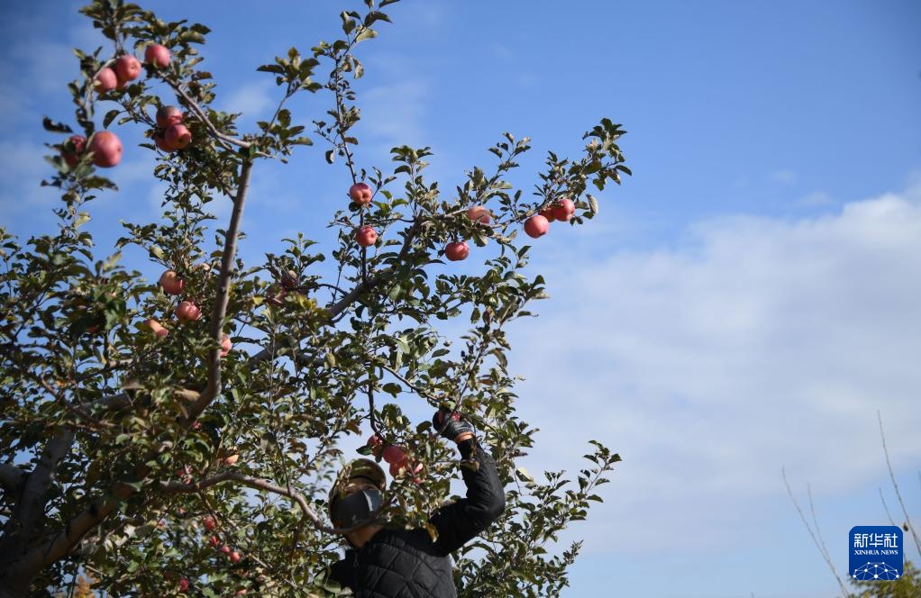 11月4日,果农在陕西省榆林市横山区赵石畔镇一处果园采收苹果。