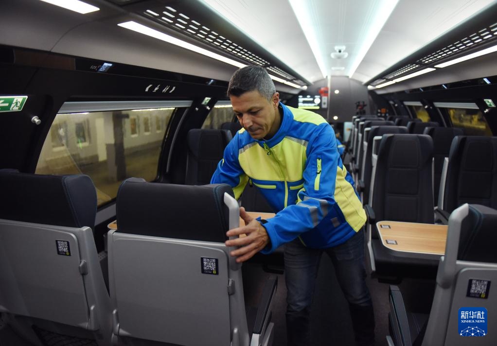 11月3日,在奥地利维也纳,奥地利西部铁路公司员工在车厢内调整座椅靠背。