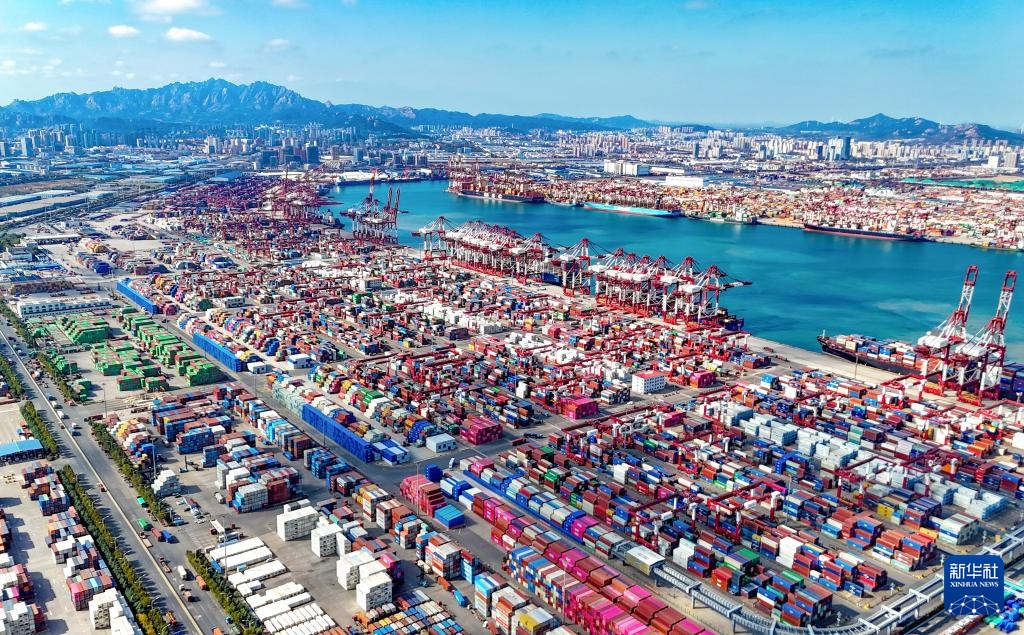 11月5日,在青岛自贸片区,数十艘货轮在装卸货物(无人机照片)。