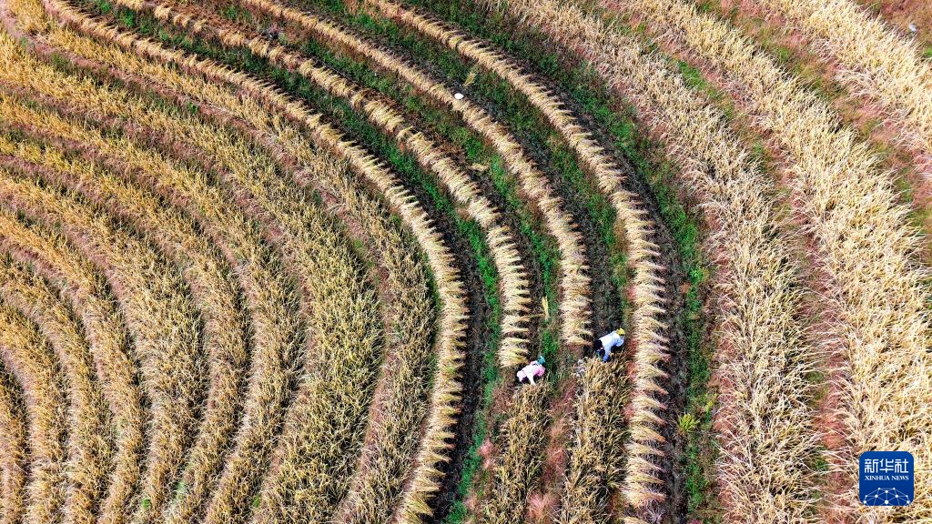 日前,广西桂林市龙胜各族自治县龙脊镇大寨村种植的水稻进入收获季节,梯田之上呈现出一派忙碌的景象。