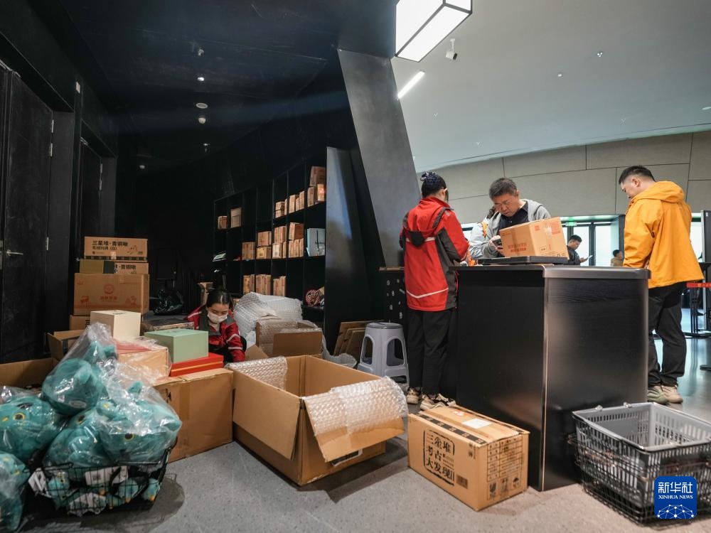 在四川省广汉市三星堆博物馆文创商店,现场快递点工作人员将游客选购的文创产品打包发货(10月30日摄)。