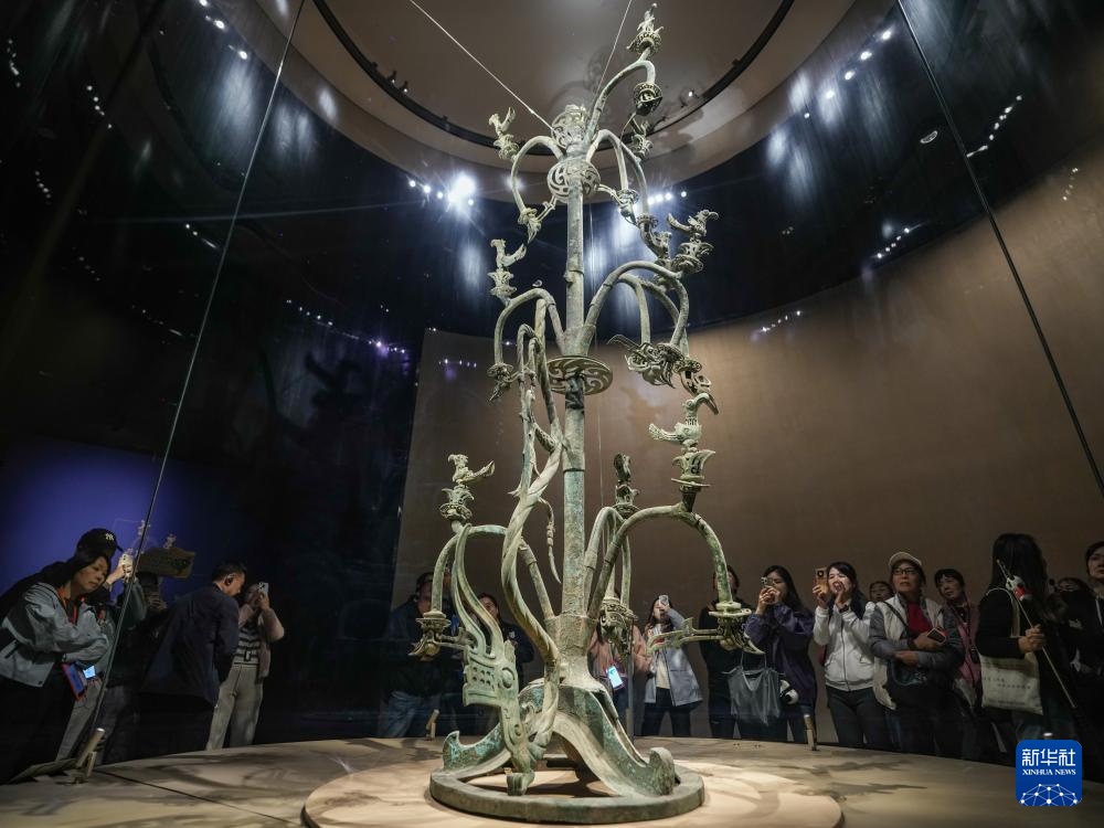 游客在四川省广汉市三星堆博物馆参观青铜神树(10月30日摄)。