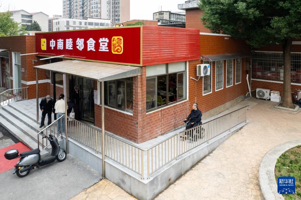 11月6日,在长沙市望城区高塘岭街道中南社区,行动不便的居民通过无障碍通道进入睦邻食堂就餐(无人机照片)。