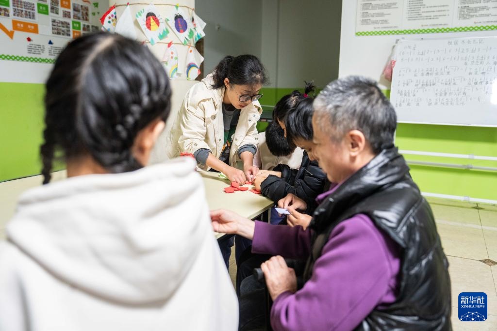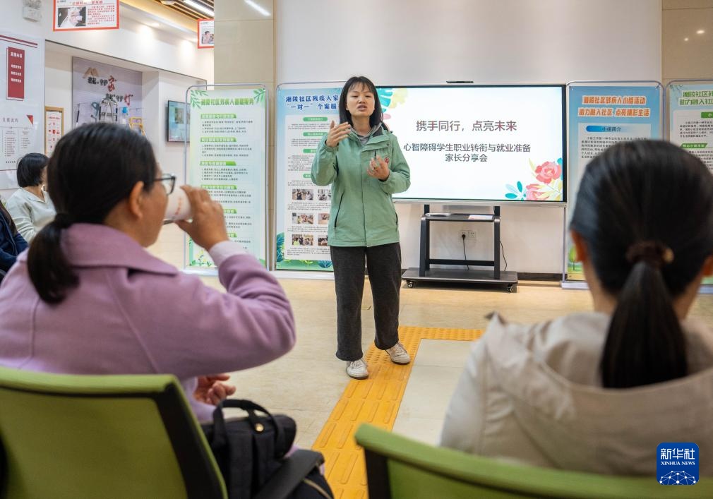 11月6日,在长沙市望城区高塘岭街道湘陵社区,志愿者(右二)为有心智障碍学生的家长进行指导。