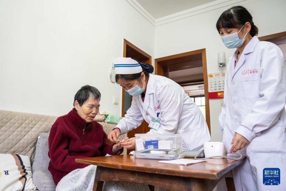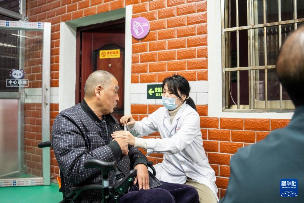 11月6日,在长沙市望城区高塘岭街道中南社区,医务人员定期上门为行动不便的居民(左)检查身体。