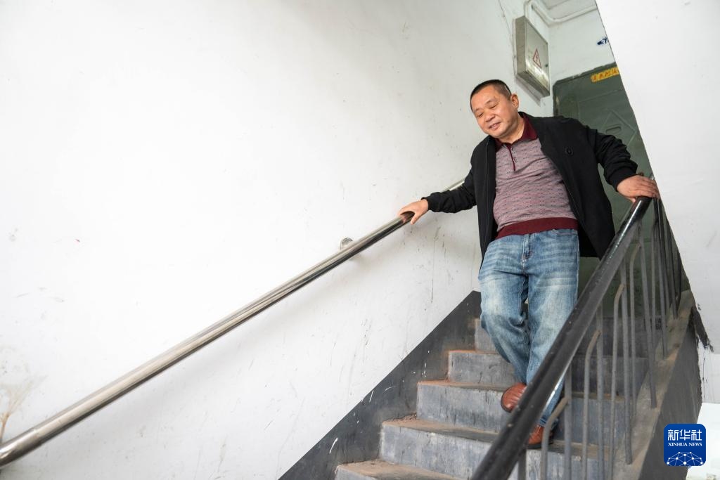 11月6日,在长沙市望城区高塘岭街道中南社区,行动不便的居民使用无障碍改造过的楼梯扶手自行走下楼梯。