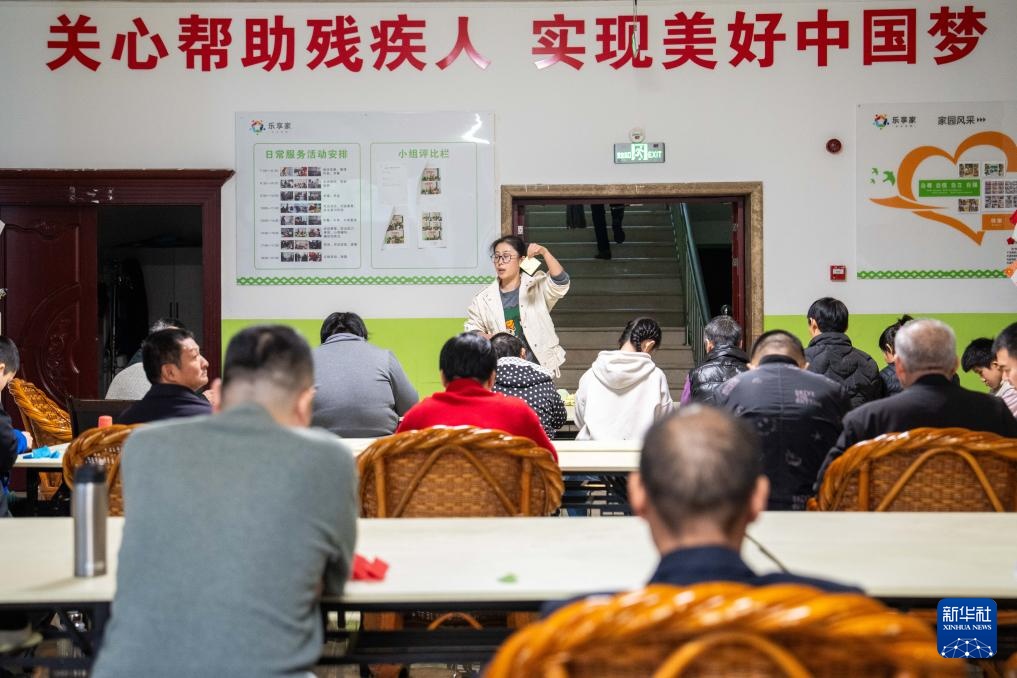 11月6日,在长沙市望城区怡康心智残障人士托养中心,工作人员(左二)为残疾人士进行职业技能培训。