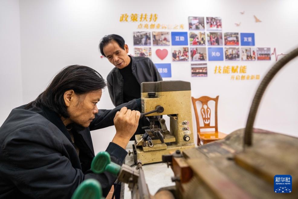 11月6日,在长沙市望城区高塘岭街道中南社区,行动不便的居民(左)在社区免费提供的助残小屋里为居民配钥匙。