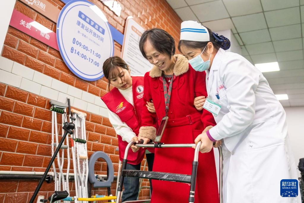 11月6日,在长沙市望城区高塘岭街道中南社区,志愿者及医务人员帮助行动不便的居民(中)使用康复器具。