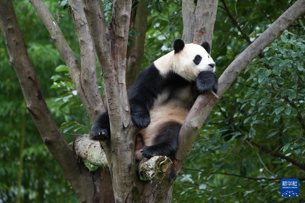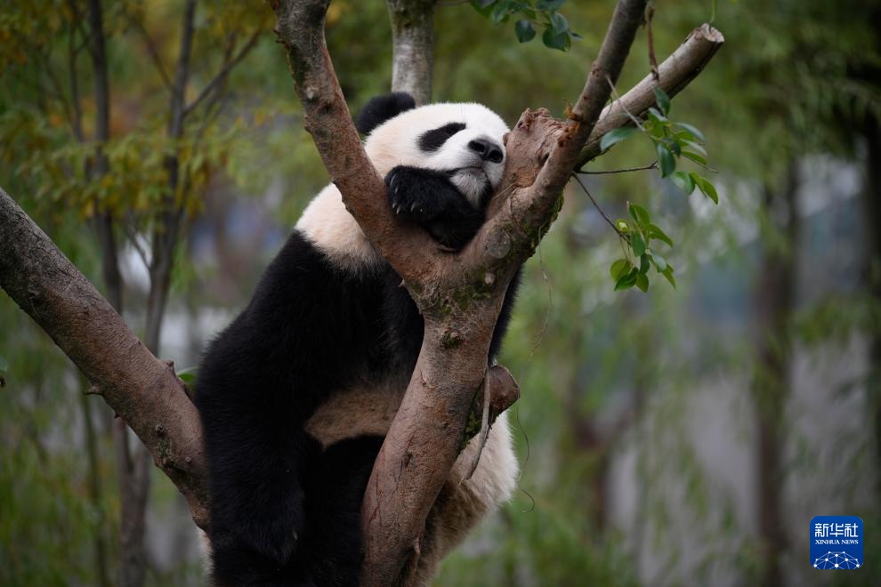 11月6日,在中国大熊猫保护研究中心神树坪基地,大熊猫“福宝”在树上休息。