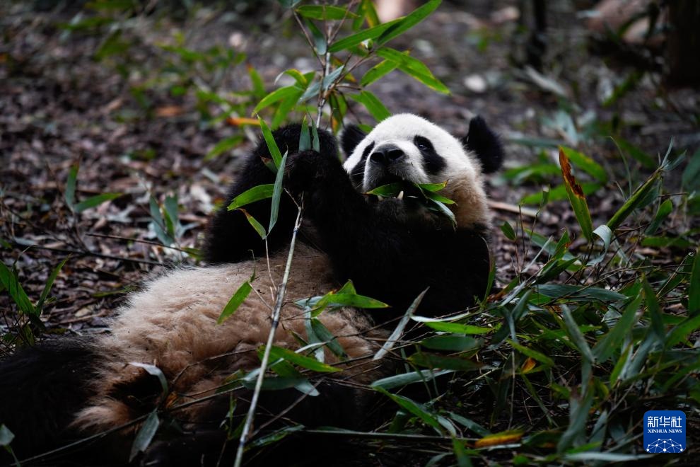 11月6日,在中国大熊猫保护研究中心神树坪基地,大熊猫“灿阳”在吃竹子。