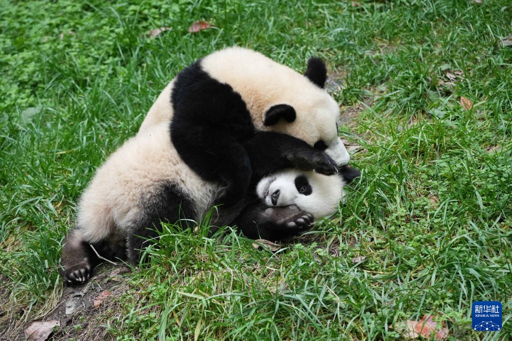 11月6日,在中国大熊猫保护研究中心神树坪基地,大熊猫“灿阳”(上)和“青阳”玩闹。