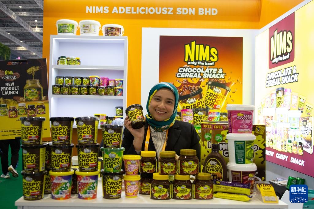 11月7日,在农食产品展区,马来西亚对外贸易发展局一处展台的工作人员展示一款巧克力产品。