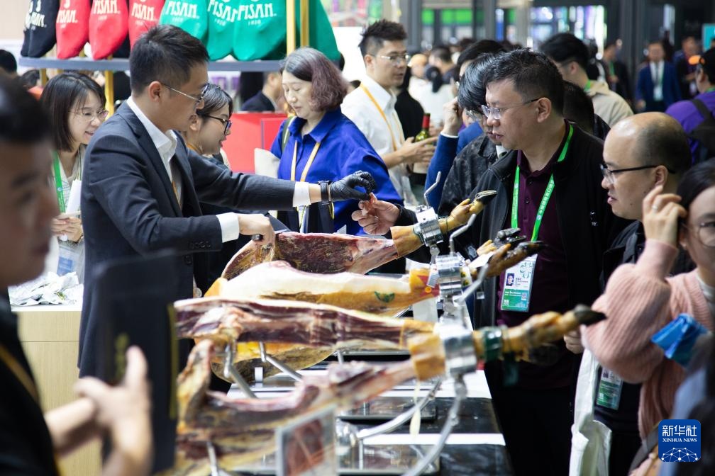 11月7日,在农食产品展区西班牙火腿品牌优选展台,参观者排队品尝西班牙伊比利亚火腿。
