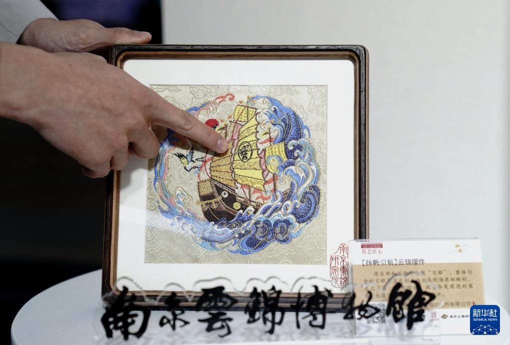 11月7日,参展商在第八届进博会江苏展区介绍南京云锦博物馆展品。
