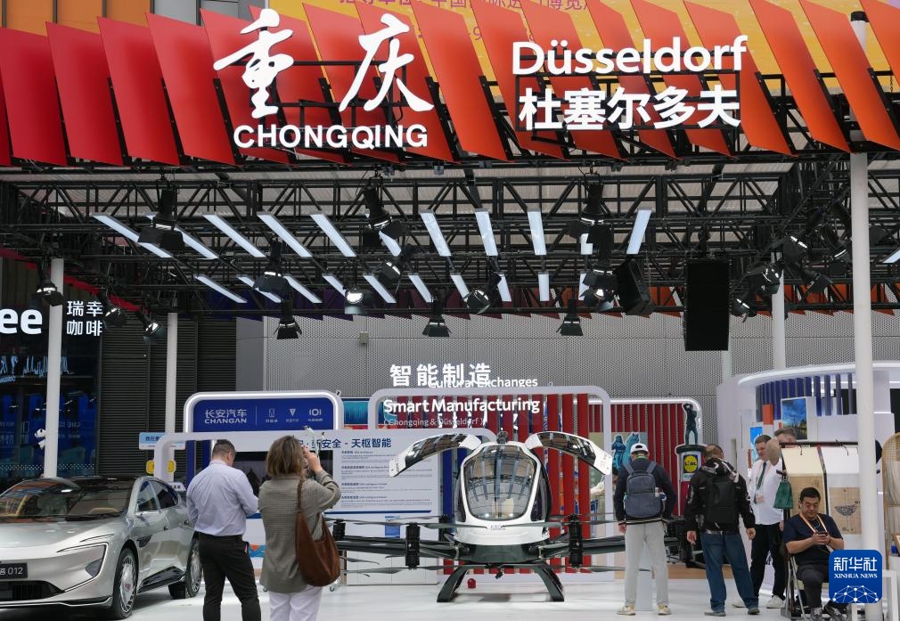 这是中国重庆与德国杜塞尔多夫在第八届进博会上共同举办的双城联展现场,展出内容涵盖文化、经贸等领域合作成果(11月8日摄)。