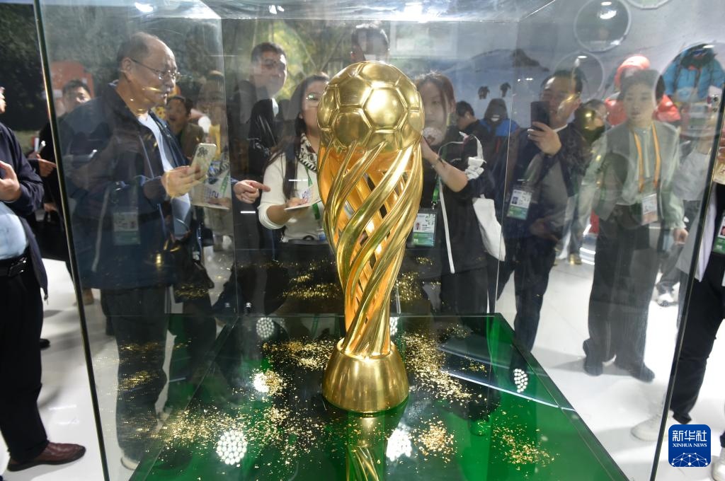 11月6日,观众在第八届进博会江苏展厅参观拍摄2025年“苏超”冠军奖杯。