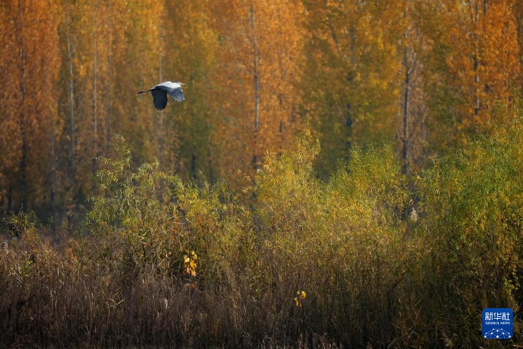 初冬时节,在河北省邢台市隆尧县亦城村泜河沿岸,树叶金黄,与水面、河岸相映衬,勾勒出一幅美丽和谐的自然画卷。