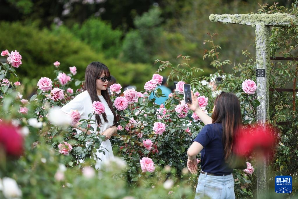11月9日,游客在新西兰奥克兰帕内尔玫瑰园拍照。