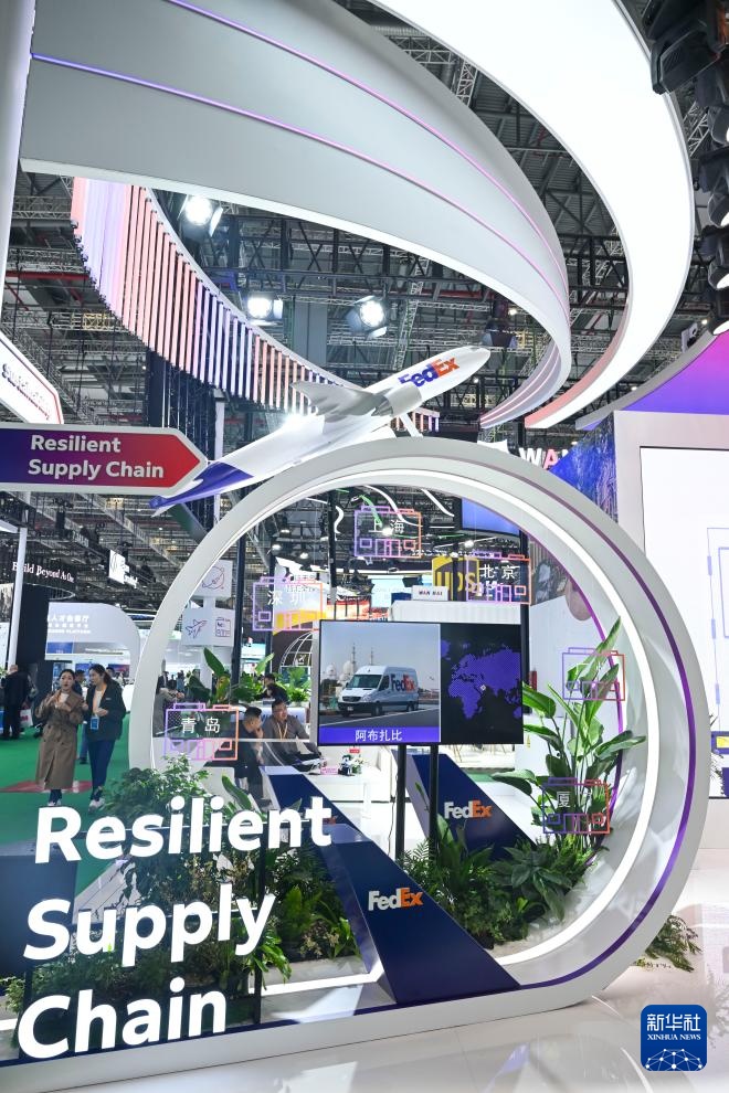 11月9日,人们在第八届进博会服务贸易展区联邦快递(FedEx)展台交流。