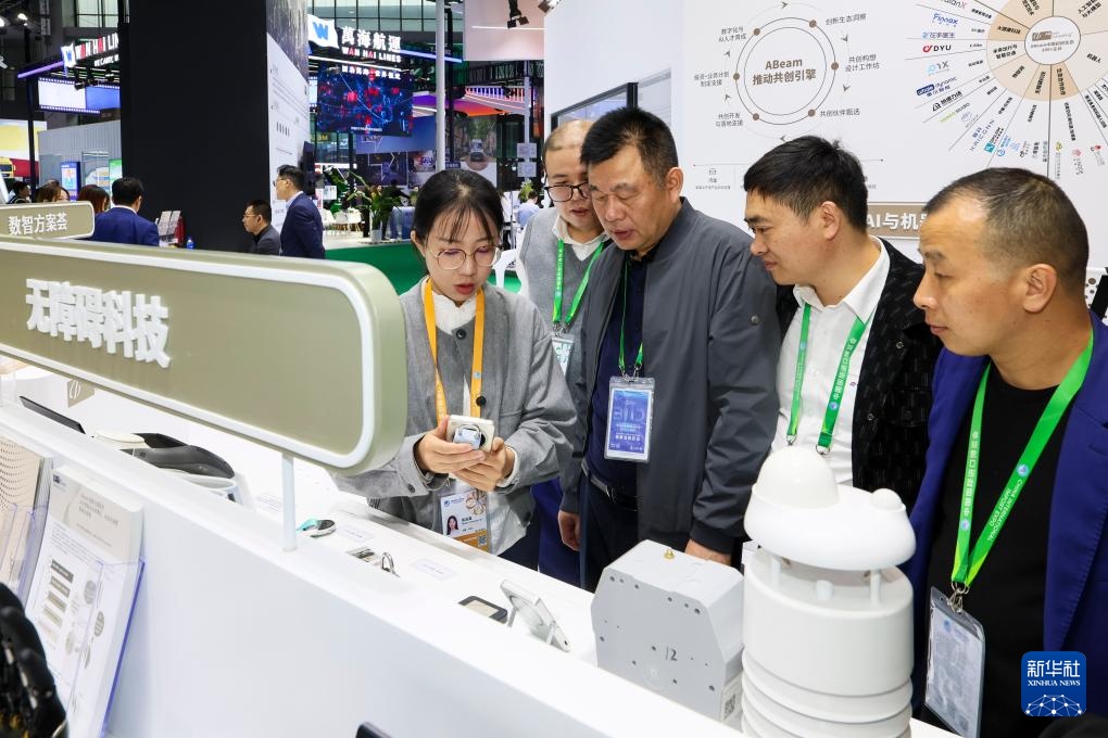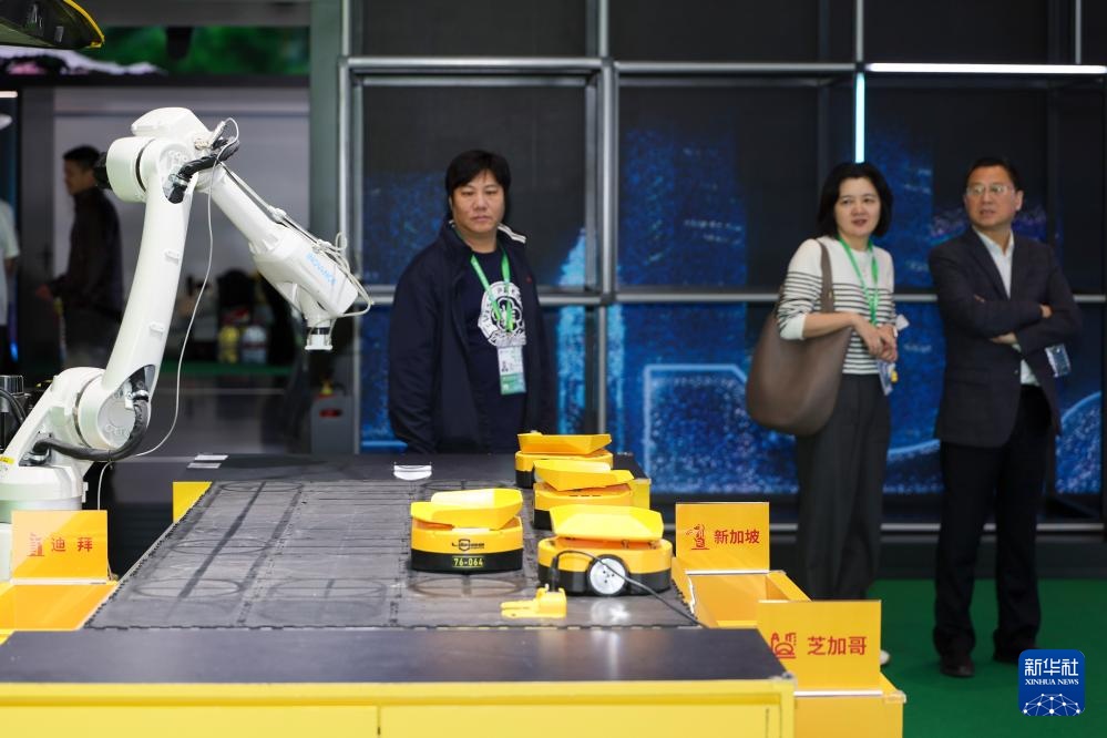 11月9日,参展人员在第八届进博会服务贸易展区DHL(敦豪)展台查看智能物流系统。