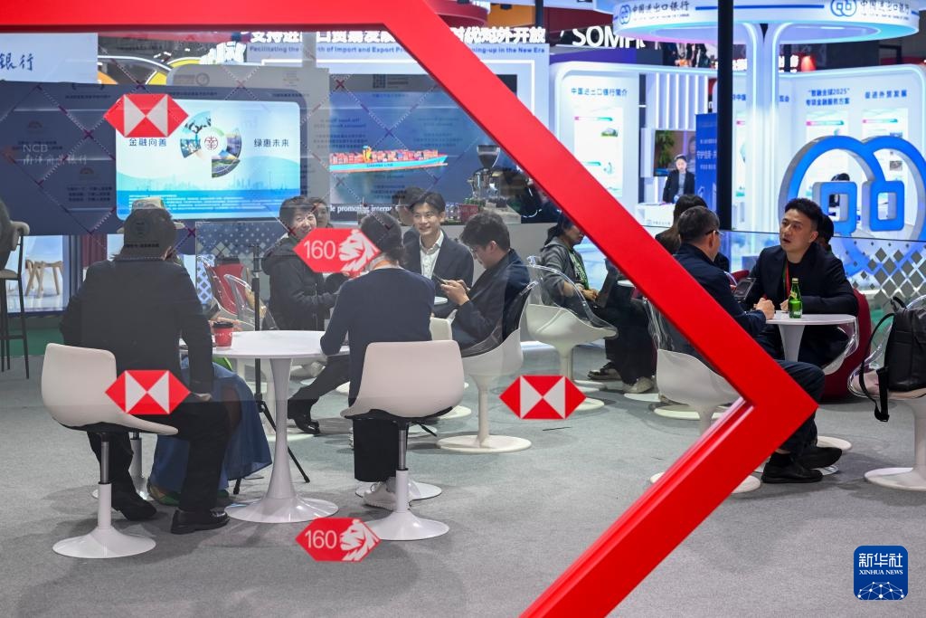 11月9日,人们在第八届进博会服务贸易展区汇丰展台交流。